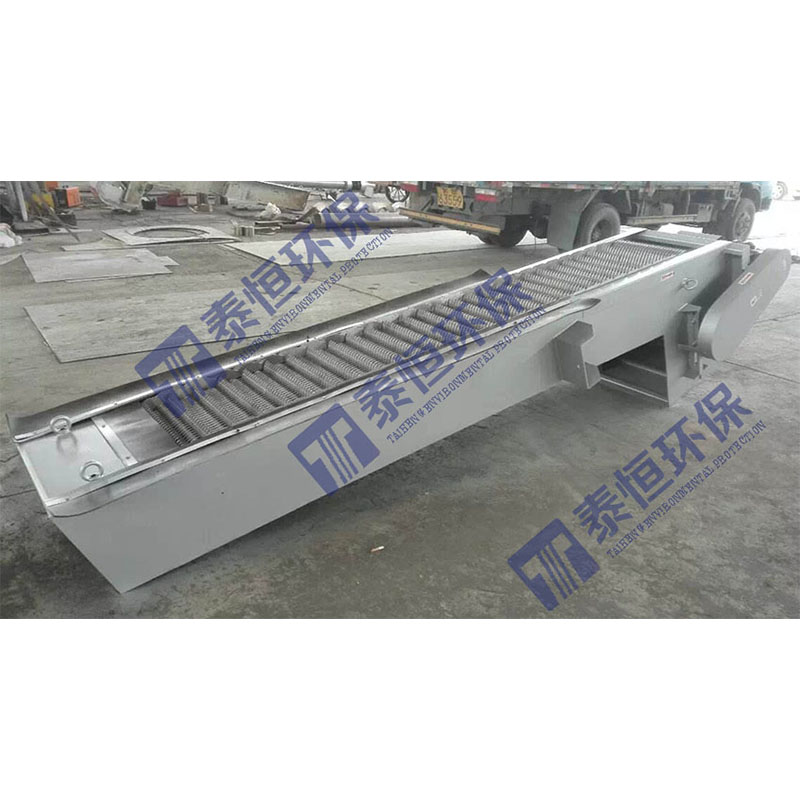 回轉(zhuǎn)式格柵除污機設(shè)備是由一種獨特的耙齒廠裝配成一組回轉(zhuǎn)格柵鏈。在電機減速器的驅(qū)動下,耙齒鏈進行逆水流方向回轉(zhuǎn)運動。耙齒鏈運轉(zhuǎn)到設(shè)備的上部時,由于槽輪和彎軌的導(dǎo)向,使每組耙齒之間產(chǎn)生相對自清運動,絕大部分固體物質(zhì)靠重力落下。另一部分則依靠清掃器的反向運動把粘在耙齒上的雜物清掃干凈。按水流方向耙齒鏈類同于格柵,在耙齒鏈軸上裝配的耙齒間隙可以根據(jù)使用條件進行選擇。當(dāng)耙齒把流體中的固態(tài)懸浮物分離后可以保持水流暢通流過。整個工作過程是連續(xù)的,也可以是間歇的。